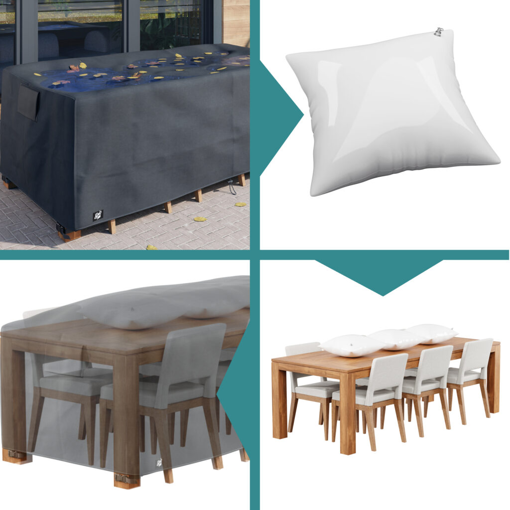 Ja – unsere Hüllen bestehen aus Oxford 600D Polyester mit verschweißten Nähten. Dieses Material ist absolut wasserdicht und hält auch starkem Regen oder Schneefall stand. Zusätzlich verhindert die spezielle Beschichtung, dass Feuchtigkeit eindringt oder sich Wassersäcke bilden. Ihr Tisch, Ihre Lounge oder Ihr Grill bleiben zuverlässig trocken.